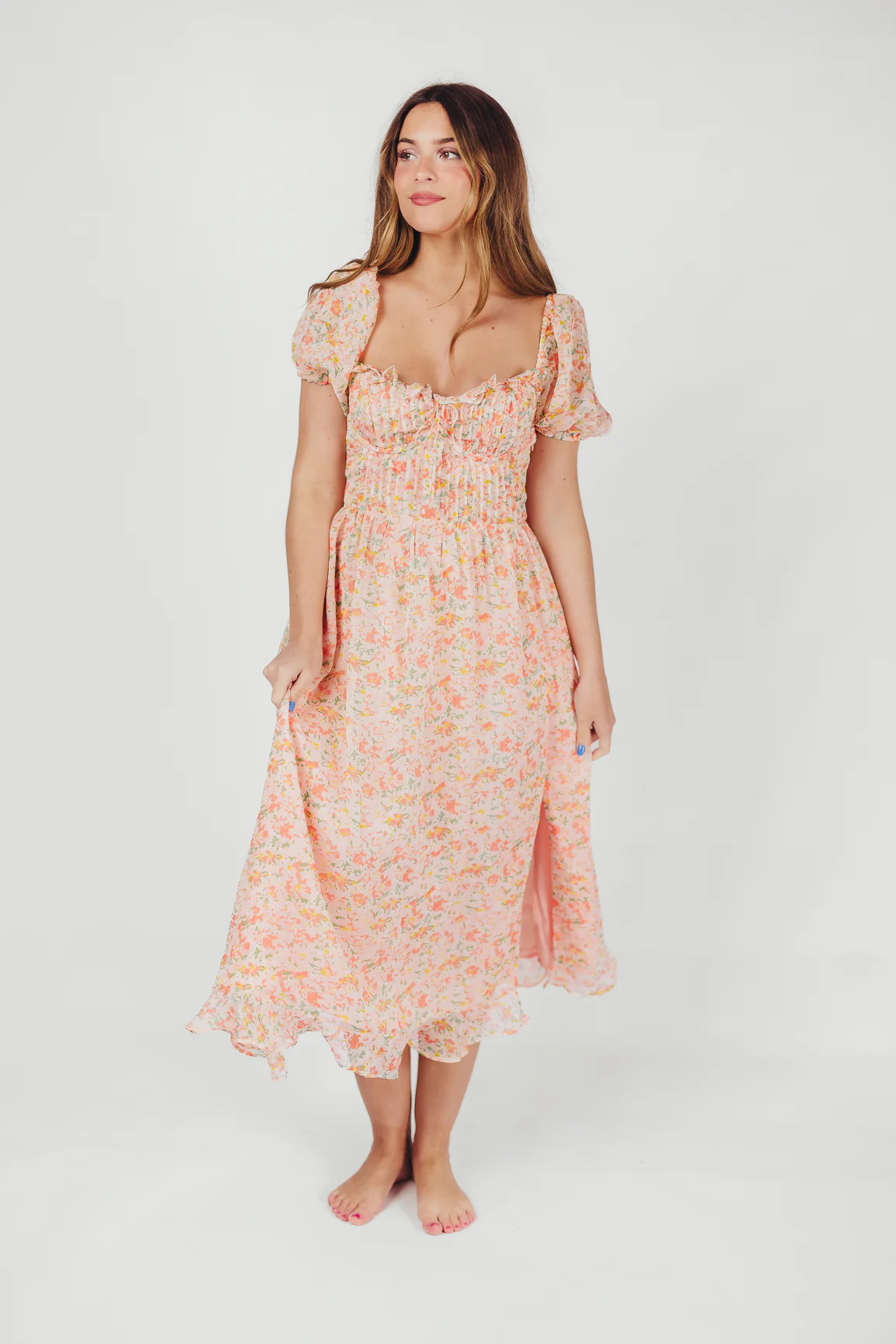 Lunaria Pleated Bustier Midi Dress in Orange Floral
